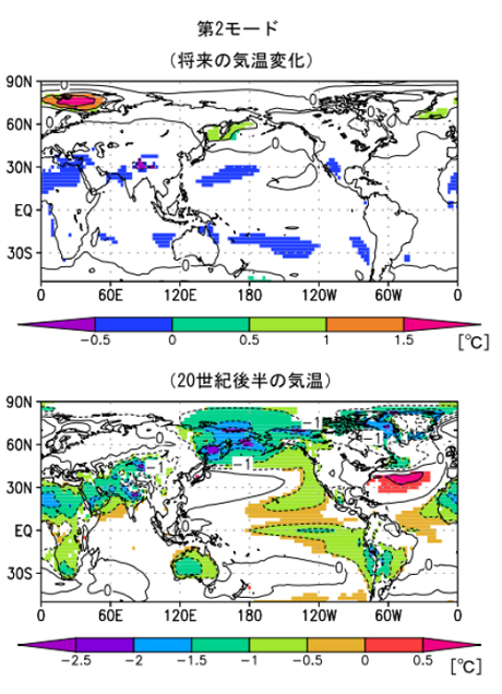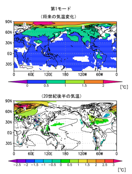 今回応用した手法を用いて、GCMで再現される20世紀後半の気温のばらつきと将来の気温変化予測のばらつきの間で、統計的に意味のある関係にある二つのモードの空間パターンが抽出できた。それぞれを第1モード、第2モードとする。