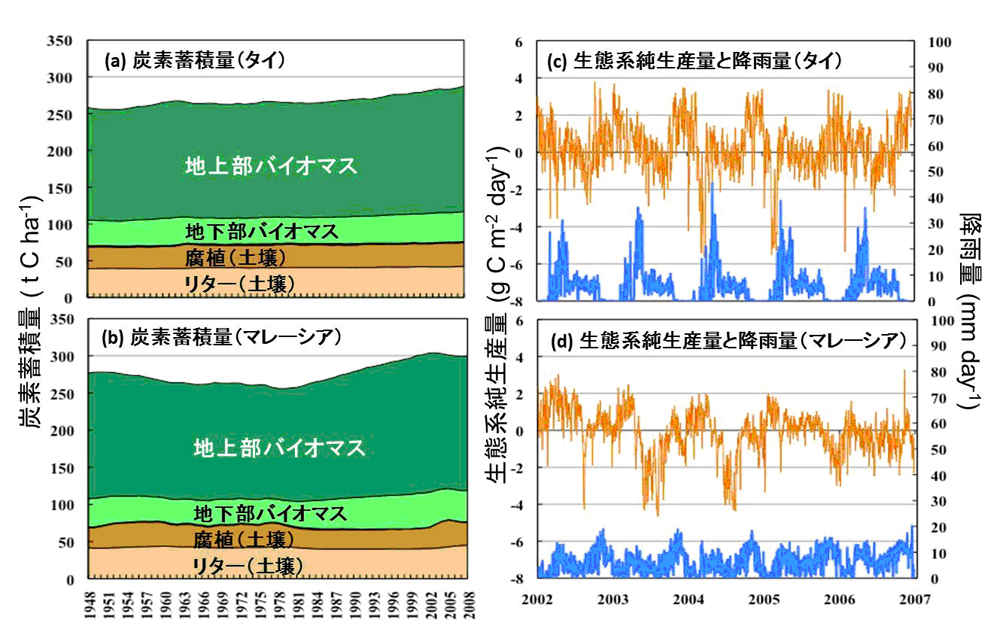地球環境問題に大きな関心が寄せられている現在でも、世界的な森林減少・劣化の傾向は継続しており、人間活動によるCO2排出のうち、森林減少による排出は約20%(年60億トンCO2)を占めている。東南アジアの熱帯林では現在でも森林面積が減少しており、例えばマレーシアでは1990年から2007年にかけて120万ヘクタールの森林が減少し、アブラヤシプランテーション面積が220万ヘクタール増加している(FAO, 2010)。そこで本研究では、陸域生態系の物質循環モデルVISITを改良し、現存する森林だけではなく、森林伐採による炭素放出とアブラヤシプランテーションに転換した際の炭素収支変化の予測を行った。同じ熱帯においても、雨期と乾期が明瞭なタイ(熱帯常緑季節林)と不明瞭なマレーシア(熱帯雨林)の異なるタイプの森林が存在する(図1)。従って、1)2つの森林におけるモデル予測値の比較検討、2)マレーシアを例とし森林伐採およびアブラヤシプランテーションへの転換による炭素収支の変化、3)モデル予測と野外観測値との比較、について検討を行った。