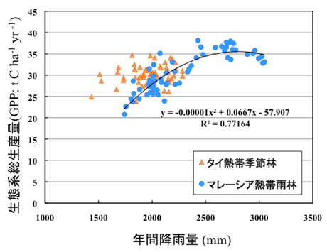 タイとマレーシアの異なる熱帯林における炭素蓄積量や炭素収支を陸域生態系モデルVISIT を用いて予測を行った(図2)。この2地域の森林におけるモデル計算の違いは、気象データと一部の土壌パラメータのみである。その結果、熱帯林の炭素蓄積量の7割以上は樹木(地上部および地下部バイオマス)に存在していることが予測された。また、雨期と乾期が明瞭なタイの森林の方が、生態系純生産量(注4)の季節変動は大きいことが予測されたが、降雨量との間には明確な関係は認められなかった。しかしながら、光合成による総生産量(GPP)と降雨量の関係はマレーシアの熱帯雨林において明確な関係が認められた(図3)。 このように、熱帯雨林の炭素吸収量は降雨量に依存しており、正確な予測には降雨データの品質が重要であることが示唆された。また、森林伐採を行ってアブラヤシプランテーションに転換した場合の、炭素蓄積量および炭素収支の変化を図4に示した。伐採時の樹木の残渣が土壌炭素として新たに加わり、時間と共に分解され減少している。この残渣量が増えると土壌中で分解される有機物が増加するため、土壌から放出される炭素量(土壌呼吸量)は多くなる。残渣量100%と仮定した場合、伐採後2年間の土壌呼吸量は森林(非伐採)の土壌呼吸量の2.4 倍になると予測された。本研究では、伐採時に33%の植物体が残渣として土壌に加わることを仮定している(図4b)。また、アブラヤシプランテーションに転換後30年の炭素貯留量は、森林状態の約35%と非常に小さいことが明らかになった。