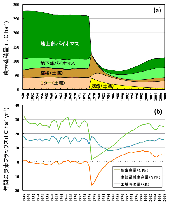 VISITモデルは、光合成による樹木の炭素固定量から落葉・落枝量、分解による放出まで、生理生態学的知見に基づいて炭素収支の計算を行うモデルである。本研究では、「森林伐採による樹木の生態系外への持ち出し」と「残渣による土壌への炭素供給」を考慮し、さらにその後アブラヤシプランテーションに転換した場合の炭素収支を計算できるようモデルの改良を行った。アブラヤシプランテーションへの転換の際には、光合成能力や土壌組成など植物と土壌のパラメータ値が単にアブラヤシのものに変化するという事象だけでなく、果実の収穫や葉の刈り取りなど、アブラヤシの管理に伴う変動も考慮に入れて計算を行った。モデル計算には、米国環境予測センターおよび米国大気研究センターによる気象再解析データから温度・日射など12要素を入力値として使用した。しかしながら、降雨量データについては、タイとマレーシア共に現地観測値との差異が大きいため、現地観測値に基づいて再解析データの修正を行って使用した。