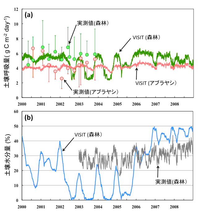 文献から得た現地観測値とVISITモデルの予測値を比較した結果、タイの熱帯常緑季節林においてはモデルの値は過小評価の傾向にあるものの、マレーシアの熱帯雨林の炭素収支を精度高く見積もっていることが示された。また、アブラヤシプランテーションの実測データは非常に少ないが、27.5年生の地上部バイオマスは現地観測値とモデル値は非常によく一致していた。このように、年間の炭素収支については現地観測値とモデルの予測値は概ねよく一致していたが、日単位での土壌呼吸量の予測結果は現地観測値の変動幅の方が大きいことが明らかとなった(図5a)。しかしながら、土壌呼吸量の現地観測値には空間的不均一性が含まれているが、モデルの結果はある程度の広がりの平均的な値を示している。加えて、アブラヤシプランテーションは30年経過すると伐採し再植林されるが、VISITモデルではまだこの影響を考慮に入れていないなどの課題も残っている。また、土壌水分量の季節変化について、モデルによる予測結果は降雨量データに強く依存し、現地観測値とは大きく異なることも分かった(図5b)。