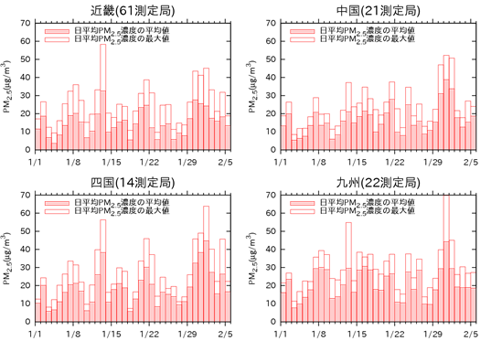 ① 西日本4地域の一般環境大気測定局(以下、「測定局」という。)における日平均PM2.5濃度の平均値と最大値を見ると、期間中に何度となくPM2.5濃度が高くなっている特徴が認められます。特に、1月13日前後、1月21日前後、及び1月30日~2月1日には4地域ともに濃度が上昇して、最大値が50μg/m3を超過する地域もありました。(図1)