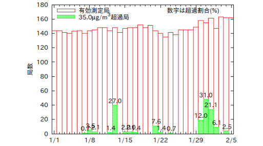 ② 全国の測定局における環境基準値超過日数(1日平均値35μg/m3を超過した日数;以下、同様)は16日でした。 1月13日、21日、30日、31日、2月1日には、それぞれ、27.0%、7.6%、12.0%、31.0%、21.1%の測定局で環境基準値を超過しました。(図2)