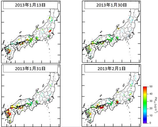 ⑤ 環境基準値超過局が多かった4日間におけるPM2.5高濃度地域は、1月13日は九州中部・瀬戸内・近畿・関東北部、1月30日は九州北部・北陸、1月31日は九州北部・瀬戸内、2月1日は九州中部・瀬戸内・東海でした。これらの結果から、主として九州北部や瀬戸内地域などの西日本で高濃度が発生し、東海や関東北部でも都市域スケールで高濃度になったと考えられます。(図4)