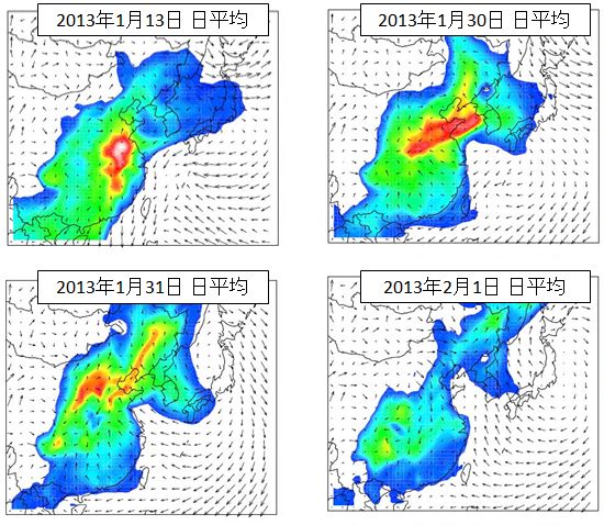① 環境基準値超過局が多かった1月13日、30日、31日、2月1日におけるシミュレーションモデルで計算されたPM2.5地上濃度と地上風(いずれも日平均値)の結果から、これらの日には、大陸で発生したと考えられるPM2.5の高濃度気塊が北東アジアの広域を覆い、その一部が日本列島の一部に及んでいる様子が伺えます。(図6)