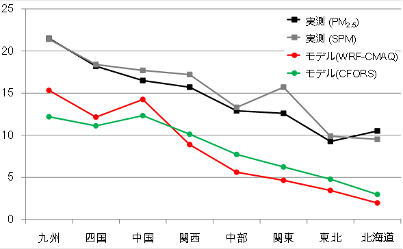 ③ 以上のシミュレーション結果は観測されたPM2.5濃度の基本的な時空間変動の特徴をほぼ捉えているものの、その再現性は必ずしも十分ではありません。例えば、図7で示すように、モデル値は実測値よりも5~10μg/m3程度、過小評価しています。従って、今後、シミュレーションモデルを改良した上で越境汚染の影響について定量的な解析を行う必要があります。