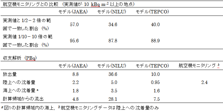 シミュレーションには、米国環境保護庁で開発された三次元化学輸送モデル(*2)を改良して利用し、図1の領域(水平分解能3km)において放射性物質の放出・移流・拡散・乾性沈着・湿性沈着(*3)の過程を計算しました。放射性セシウムの放出量データとして、ローカル規模(~50km、福島県東部)のモデルを基にした東京電力(TEPCO)による推計(*4)、ローカル規模と領域規模(~500km、東日本一帯)のモデルを基にした日本原子力研究開発機構(JAEA)による推計(*5)、および全球規模のモデルを基にしたノルウェー大気研究所(NILU)による推計(*6)を利用しました(図2)。その結果、いずれのシミュレーションも、沈着量の高い地域(福島東部、関東北部、宮城北部など)を再現していますが、NILUの推計値を用いた計算では沈着量を過大評価し、TEPCOの推計値を用いた計算では沈着量を過小評価していました(図3、図4)。その中でJAEAによる推計値を用いたシミュレーションが実測値を最も良好に再現しており、シミュレーション結果は高沈着量地域(10kBq m-2以上)において、57%の地点で実測値と1/2-2倍、約96%の地点で実測値と1/10-10倍の範囲で一致していました(表1)。また日本の陸上へのセシウム137の沈着量も、NILUの推計値を用いた計算(5.0PBq)は実測値(2.4PBq)を2倍以上過大評価しており、TEPCOの推計値を用いた計算(0.95PBq)は実測値を2倍以上過小評価しているのに対して、JAEAの推計値を用いた計算結果(2.2PBq)は実測値とよく一致していました。これは、JAEAの放出量推計では、今回のシミュレーションの計算領域(東日本一帯)に広く分布した観測データを用いたため、および今回のシミュレーションと同程度の空間スケール(領域規模)のシミュレーションモデルを用いたためと考えられます。この結果は、ローカル規模や全球規模のモデルを用いて推計した放出量データを基にした、東日本一帯など領域規模の大気輸送沈着シミュレーションの結果では大きな不確実性を伴うことも示唆しています。