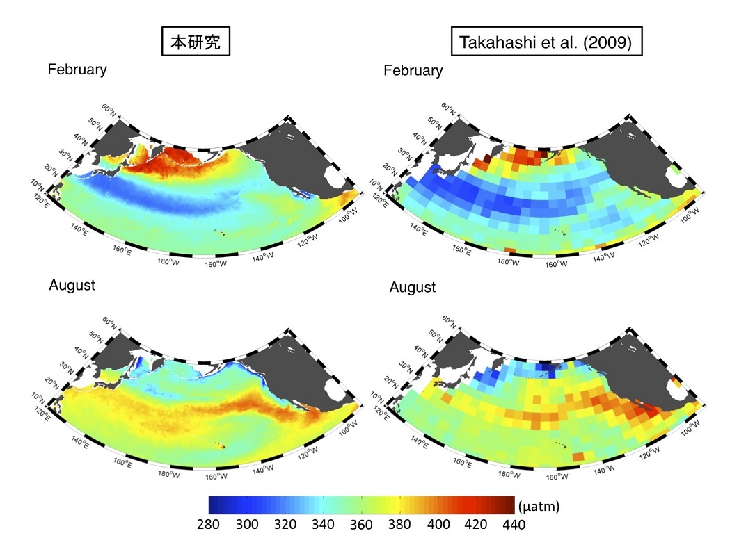 本研究で再現されたCO2分圧値を7年間平均して得たマップとTakahashi et al. (2009)によって示された月毎のCO2分圧平年値を比較しました(図2)。Takahashi et al.によるマップは、海洋のCO2吸収の研究をするとき、標準的な海洋CO2分圧値を与えるマップとして、頻繁に用いられる有名なものです。両者の分布は似ていますが、本研究のCO2分圧推定は解像度が高く、海洋循環の特徴をより正確にとらえています。たとえば、2月の北太平洋高緯度域において本研究の推定は、ベーリング海から北日本沿岸にかけて、東カムチャツカ海流に沿うように、連続した高いCO2分圧が見られています。また、アリューシャン列島からカルフォルニア沖にかけての沿岸域で、生物活動が盛んになる春から秋にかけての低いCO2分圧が再現されています。