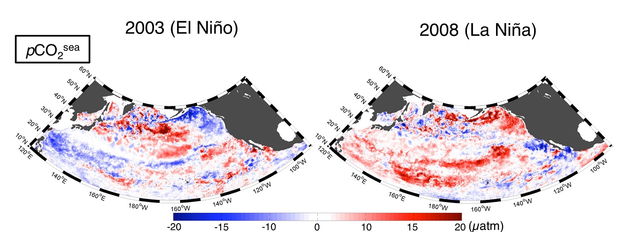 太平洋赤道域東部で数年おきに起こるエルニーニョ・ラニーニャ現象は、北太平洋の気候に大きな影響を与えます。赤道域のCO2分圧がエルニーニョ・ラニーニャ現象に伴って大きく変化することは知られていましたが(Feely et al. 2006)、北太平洋全域のCO2分圧に影響を及ぼすかどうかは知られていませんでした。そこで、典型的なエルニーニョの年である2003年とラニーニャの年である2008年冬季(1月から3月)のCO2分圧の平年値からのズレ(偏差)を調べてみたところ、2003(2008)年は平年に比べて、亜熱帯域西部で分圧が低く(高く)、亜熱帯東部では分圧が高い(低い)ことがわかりました(図3)。そして、前者は海面水温の変化に対する応答、後者は混合層深度の変化に対する応答と解釈できました。