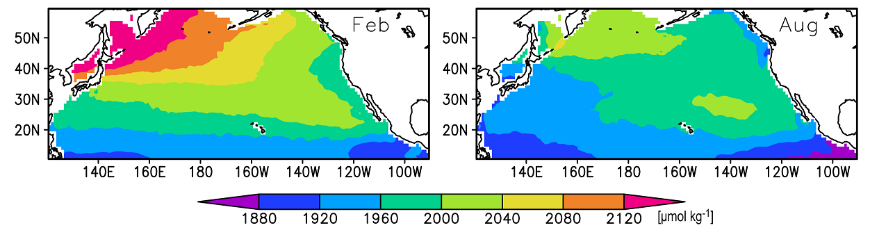 Yasunaka, S., Y. Nojiri, S. Nakaoka, T. Ono, H. Mukai, and N. Usui (2013), Monthly maps of sea surface dissolved inorganic carbon in the North Pacific: Basin-wide distribution and seasonal variation, J. Geophys. Res. Oceans, 118, 3843–3850, doi:10.1002/jgrc.20279.