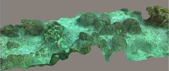 これまで浅海底の反復調査では、GPSが使えないことから、調査対象を特定するために目印などを使う必要がありましたが、本システムによる撮影画像は全画素に位置情報を持つことから、精確な反復調査が容易になります。また、高さ情報も同時に得られることから海底地形やサンゴ・海藻等の三次元形状と現存量の経年変化の抽出も容易となります。