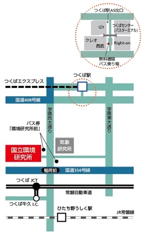 ・東口1番バス乗り場からバス「つくばセンター」または「筑波大学中央」行き、「環境研究所」下車(約20分)