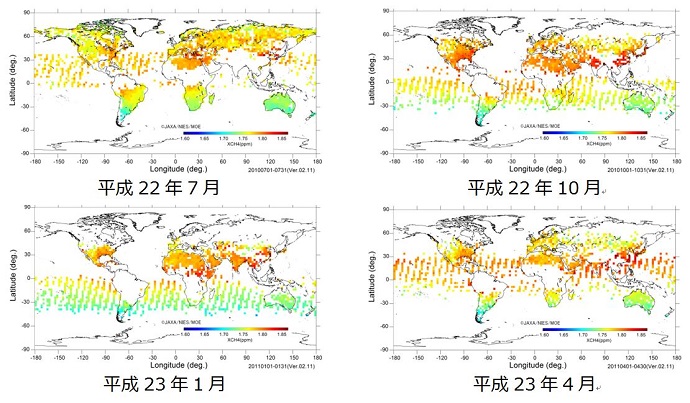 「いぶき」によって測定されたメタンカラム平均濃度の月別全球分布の例を図1に示します。メタン濃度は1年を通して南半球より北半球のほうが高いことや、北半球の中でも季節や場所によって濃度が異なることがわかります。