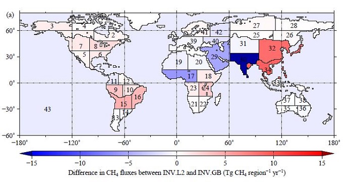 メタンの発生源は多岐にわたるうえ、全球に広く分布し、その発生源強度も時間・空間的に不均一なため、正味のメタン収支の時空間分布を広域で定量的に把握するには、百数十点ほどある地上観測点での観測結果を用いてもまだ十分とは言えませんでした。今般、メタン濃度の地上観測ネットワークによる測定データ(注5)に「いぶき」観測データを加えることにより、平成21年6月から平成23年5月までの24ヶ月分の、地球を43分割した地域における月別のメタンの正味収支(以下「正味収支」(注6)とします。)の推定結果が得られました。