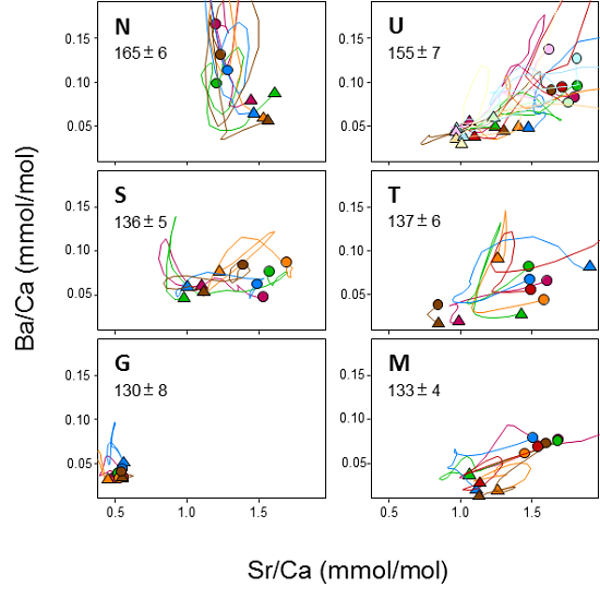 (3)しかし、死んだ場所(漁師によって漁獲された場所)のSr-Ba値は、それぞれの地点の水質を反映して異なること(p<0.05)が示されました(図3)。