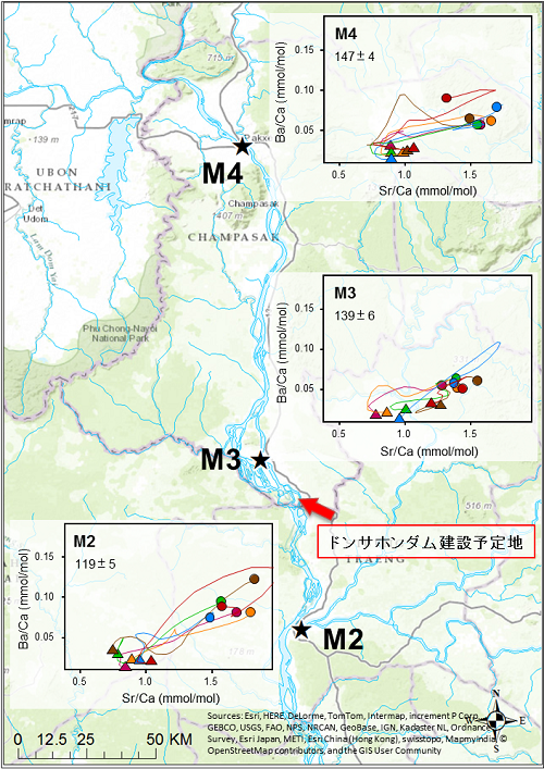 (2)しかし地域間では、回遊の経路と規模が大きく異なります。中でもガム川の魚のプロファイルは、比較的大型(>130 mm)の個体であったにも関わらず、SrとBaの濃度はほとんど生存中に変化がなく、グラフの狭い範囲内で完結していました。そして他の地域のプロファイルとも重複しないことが注目されます。この支流にはすでに5基の灌漑用ダムが建設されており、これらの障害物により魚の回遊行動が著しく制限されていること、そして恐らくガム川からメコン本流への回遊はなく、生涯をこの小さな支流(図1)で終えていることが、これらのプロファイルが意味することだと考えられます。
