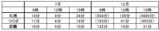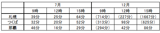 この結果から、7月(夏季)は、10 μgのビタミンD生成に必要な日光浴時間は短く、昼間は紅斑紫外線防御が必要であることが判ります。一方12月(冬季)は、有害な紫外線量に達する危険性は那覇以外はかなり小さく、ビタミンDの生成量の確保が問題になると考えられます。特に緯度の高い札幌の冬季には、太陽紫外線の最も強い晴天日の真昼でも、10 μgのビタミンD生成に、毎日139分という長時間の日光浴が必要となることが判りました。実際には冬季の札幌は晴天日が少ないため、計算上はさらに長時間の日光浴をした方が良いことになります。ただし、顔と手の甲だけではなく、足や腕など日光に当たる部位を増やすことによって、必要な日光照射時間は短縮させることが出来ます。一方、MEDに達する時間は皮膚の露出面積には拠りませんから、冬季にはなるべく広い皮膚面積を使って太陽光を浴びるのが、ビタミンD生成のためには有効です。