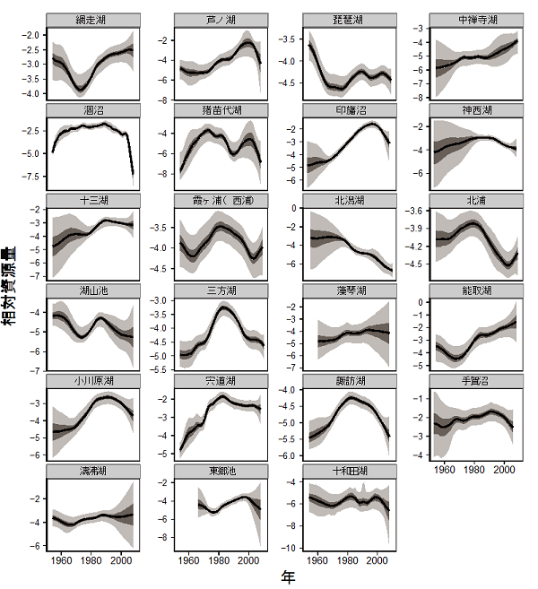 推定された相対資源量から、湖沼ごとに、過去10年(1998-2008年)、20年(1988-2008年)、30年(1978-2008年)の3期間における相対資源量の変化率と安定性について評価しました。