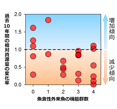 ※1: 類似した生態や機能をもつ種のグループの数。生態系プロセスや生態系機能への影響を説明するうえで、単純な種数よりも、機能群数のほうが重要であることが知られています。本研究では、魚食性外来魚7種について、サイズ・食性・生息場所・産卵数など様々な生態学的な特性に基づき(参考文献4)、5つの機能群に分類しました。