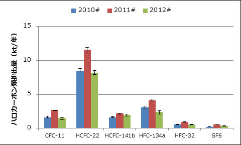 成分別では、HCFC-22が震災後の全排出量増分の約半分を占めていました。HCFC-22は主に冷媒として用いられることから、震災による被害を受けた冷蔵庫やエアコンから大気へ排出されたと考えられます。HCFC-22の排出量は2011#に38%増加しました。一方、CFC-11は既に全廃されているにも関わらず、その排出量には72%もの増加が見られました。これは、かつて発泡剤として使用され、その後長期間にわたって建物等の断熱材中に気泡として閉じ込められていたCFC-11が、建物の倒壊や震災廃棄物の処理過程における断熱材の破砕に伴って、大気へ排出されたものと考えられます。