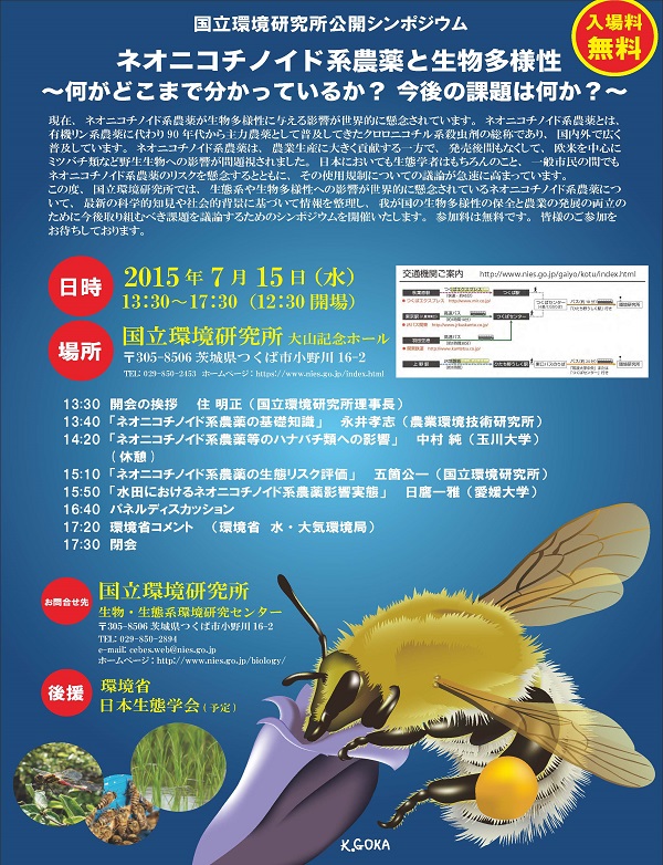 本シンポジウムでは、ネオニコチノイド系農薬の生態影響・生物多様性影響に係る基礎情報及び科学的知見を事実に基づいて整理し、今後、我が国の環境保全のために取り組むべき課題を議論します。