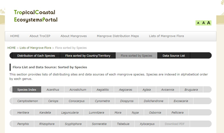 国立環境研究所と特定非営利活動法人国際マングローブ生態系協会(ISME)は、世界のマングローブの分布図およびマングローブの構成植物種リストを『熱帯・亜熱帯沿岸生態系データベース: Tropical Coastal Ecosystems Portal (TroCEP)』URL:http://www.nies.go.jp/TroCEP/index.htmlとして公開します。ダウンロードも可能です。 TroCEPは、熱帯・亜熱帯沿岸生態系の基礎情報を集約して公開することで、本生態系への理解を深め、その保全の推進を目指すものです。世界のマングローブ植物の分布に関する情報を、学術論文・本・報告書・現地調査等様々な情報源をもとに整備し、一括して公開するのは世界でもほとんど例のない取り組みです。今後はサンゴ礁、藻場、干潟などの分布情報についても整備を進めて行く予定です。 |
