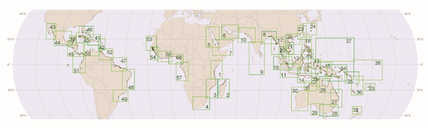 マングローブの分布域は、年々減少していることもあり正確には把握されていませんが、World Atlas of Mangroves(文献2)では123の国・領土にまたがり、その面積は約152,360 km2とされています。TroCEPでは、世界のマングローブ分布域を地図上で示し閲覧できるようにしました。