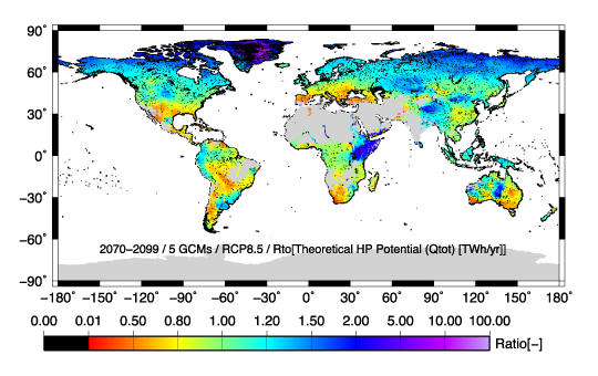 この図は、将来最も温暖化が進む想定の下で、理論包蔵水力(1年間の河川水量のすべてを地形に沿って流し落としたときに得られる発電量で、理論上可能な水力発電量の上限です)の変化を示したものです。これから70年後頃には、青い地域で増加、赤い地域で減少すると予測されます。