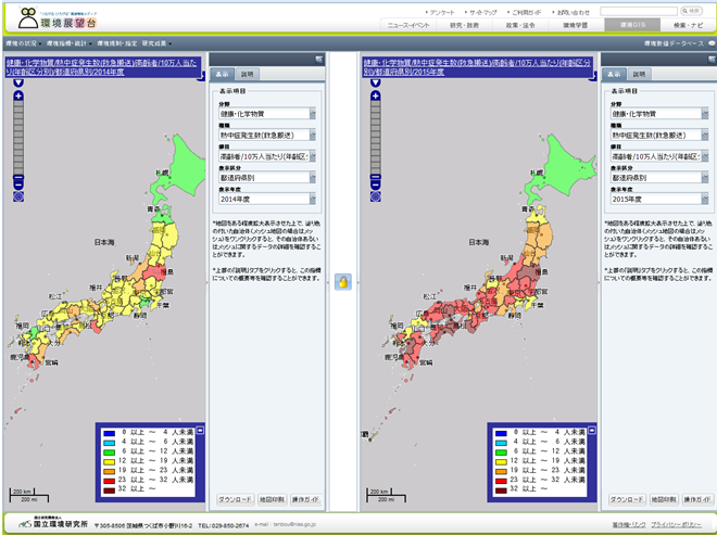 環境GIS「熱中症発生数(救急搬送)」は、総務省消防庁が公表している「熱中症による救急搬送状況」を、地理情報システム(GIS)を用いて、分かりやすく提供するもので、2008年度から表示することが可能です。