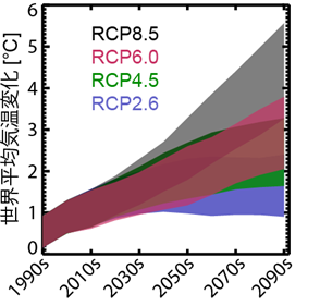 図1に、「気候変動に関する政府間パネル第5次評価報告書(IPCC AR5)」に貢献した15の気候モデルの、4つの温室効果ガス排出シナリオ(温室効果ガスの排出量が多い順にRCP8.5, RCP6, RCP4.5, RCP2.6)における世界平均気温変化予測の不確実性幅を示します。同じ排出シナリオに対しても、世界平均気温変化の将来予測には気候モデル間で大きな幅(モデル不確実性)があることがわかります。例えば、COP21で合意された世界平均気温変化を2℃または1.5℃以下に抑えるための排出量削減策(緩和策)を考える際には、モデル不確実性の上限と下限では、必要な削減量が異なり、コストの見積もりにも大きな差が生じます。そのため、予測のモデル不確実性を低減することが急務となっています。