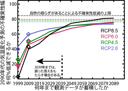 以上の方法を用いて、気温変化予測の不確実性を、いつまでにどれだけ低減できるかを評価しました。