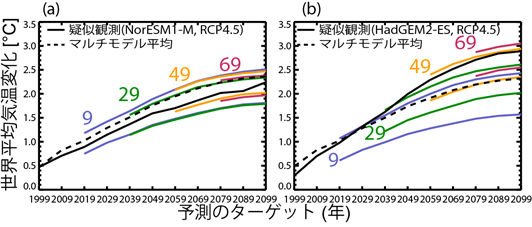 図2(a)に、あるモデル(NorESM1-M)のRCP4.5実験を疑似観測データとした場合の例を示します。観測データが2009年、2029年、2049年、2069年と蓄積することによって、“正解”である疑似将来観測データに向かってASK予測の不確実性幅が狭まっていくことが分かります。一方、別のモデル(HadGEM2-ES)のRCP4.5実験を疑似観測データとした場合(図2b)、2009年または2029年までの観測データを用いたASK予測は、”正解“(黒実線)からの外れ幅が広がっていきます。これは観測データが十分でないことと、温室効果ガスの加熱効果と大気汚染物質の冷却効果の相対的比率が2030年代前後で大きく変わることにより、ASK予測が外れたものと考えられます。ただし、観測データが蓄積するほど正解(疑似観測データ)に近寄り、2049年以降のデータが得られれば、正解に向かって不確実性幅が収束していくことがわかります。