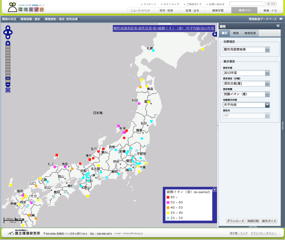 環境GIS「環境の状況:酸性雨調査結果」では、環境省による酸性雨対策調査、及び全国環境研協議会(全環研)による酸性雨全国調査について、1999年度以降のモニタリング結果を地理情報システム(GIS)を用いて提供しております。