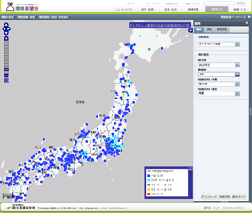 環境GIS「環境の状況:ダイオキシン調査」では、ダイオキシン類対策特別措置法に基づいて都道府県等が実施したダイオキシン類常時監視 について、2003年度以降のモニタリング結果を地理情報システム(GIS)を用いて提供しております。