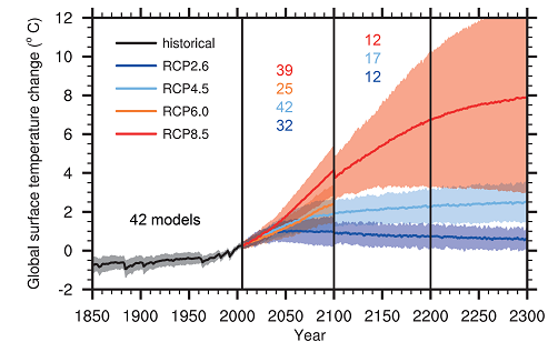 将来の人口、GDPには長期気候変動研究で一般的に用いられるShared Socioeconomic Pathways(通称SSPs; 共通社会経済シナリオ)の中庸なSSP2というシナリオを用いた (2100年において世界全体の人口は約90億人、GDPは2005年の約5倍)。将来の気候条件には4つのケースを想定した。最も気温が上昇するケースは、2100年の地球の平均気温が産業革命以前から4.5℃上昇し、これは気候変動対策を特に取らないケースに相当する。これとは逆に気候変動対策を最も強く推進し、排出量を低減させ、2100年の地球の平均気温が1.7℃上昇するケースが最も気温上昇が低いケースである。このケースはパリ協定おける究極的な長期的気候目標(通称2℃目標)に相当する。残りの二つのケースはそれらの間に位置する(図 1)。それぞれの気候条件に対して5つの気候モデルを用いた。これは気候モデルの出力には不確実性があるため、その不確実性を考慮するためである。