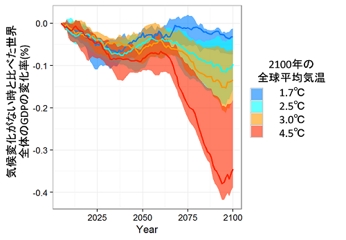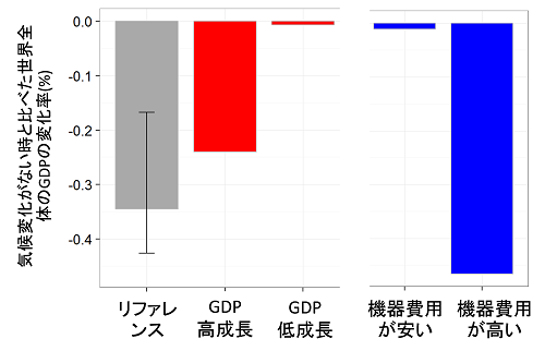 図 2に、世界全体のGDPの変化率を示す。ここでは気候条件が現在と同じである仮想的なケースと比べて気候変化がある場合にどの程度GDPが変化するかを示している。気候変動対策を特に取らないケース(図 2中では4.5℃ケース)は、2100年におけるGDPの変化率は-0.34% (−0.39% ~ -0.18%)となった。一方、気候変動対策を取り、温室効果ガス排出削減を最も強く行ったケース(図2中では1.7℃ケース)では、その影響が−0.03% (−0.07% ~ −0.01%)となり、対策をとることにより、経済へのマイナス影響が軽減できることがわかった。ただし、本推計の結果は想定する将来のGDPに強く依存することも同時に示され、経済成長率が高いほど途上国ではエアコン需要が高くなるため、気候変化に対してより大きな影響が出ることが明らかとなった(図 3左)。また、冷暖房機器の費用の想定も結果に大きな影響を与え、仮に機器費用が安い場合は気候変化の影響は小さくなることが分かった(図 3右)。