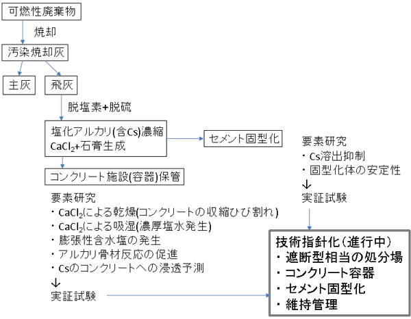 可燃性廃棄物は焼却により減容化しますが、その際、放射性Csが焼却飛灰に濃縮するだけではなく、セメント・コンクリートの材料への影響の観点で重要な変化が生じます。その概要を図2にまとめます。焼却プロセスにおいては、発生する塩化水素ガスと亜硫酸ガスを中和するため、排ガス中に石灰を添加し、バグフィルターで塩化カルシウムと石膏として除去します。この二つの物質の特性がコンクリートの安定性に影響を及ぼします。従来、コンクリート工学においてこのような焼却灰とコンクリートとの相互作用は考慮されてきませんでした。そこで、この機構を考慮した焼却灰のセメント固型化5 、もしくはコンクリート施設(容器)での処分に必要な要素研究を行っています。