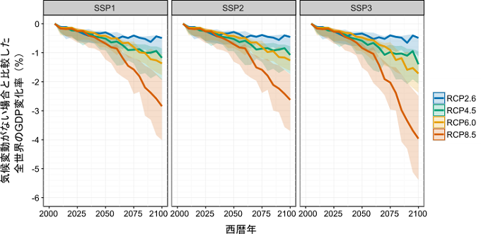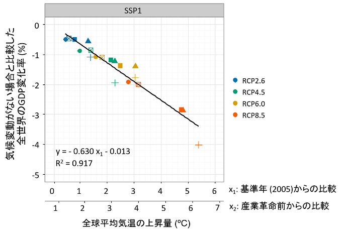 ところで、パリ協定では、2℃目標に加えて1.5℃目標にも言及されています。そこで、平均気温0.5℃の違いで、どの程度の差が生じるかを調べるため、気温の上昇とGDP損失の間の関係を調べました。その結果、両者の間にはほぼ線形の関係があることも分かりました(図2)。たとえば、SSP1の社会経済シナリオの下では、グラフの傾きは1℃の全球平均気温上昇につきGDP損失が約0.6%であり、全球平均気温0.5℃の違いは、約0.3%のGDP損失の違いに相当すると推定されました。