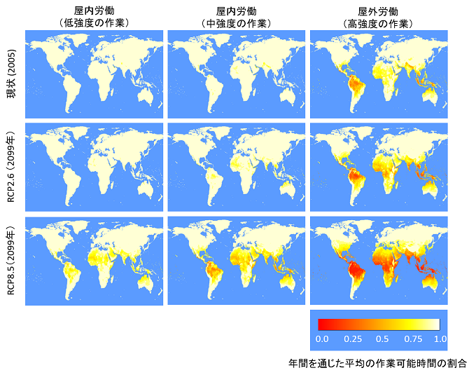 また、作業可能時間の減少量は、地域によって大幅に異なることも示されました。推計された作業可能時間の割合の地理的分布を、作業強度、作業場所ごとに示したものが図3です。アジア、アフリカ、中南米などの緯度の低い地域が特に大きな影響を受けることが分かります。現在における開発途上国(エアコンの普及率が低く、産業がより労働集約的な国)の多くは、これらの地域に位置しています。つまり、暑熱ストレスに対してより脆弱な地域がより大きな暑熱ストレスを受けるという構図になっていることが分かります。したがって、地球温暖化による影響を最小限に抑えるには、温室効果ガスの削減といった温暖化を防ぐための対策に加えて、特に開発途上国における社会経済的な状況の改善も重要であることを示唆しています。