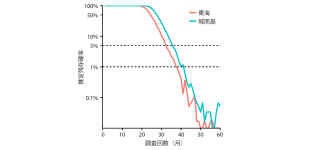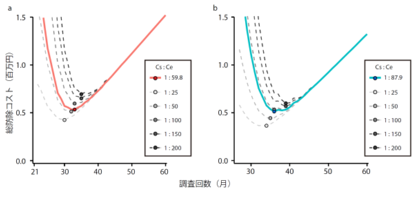 モニタリングは、毎月3日間、粘着トラップを建物や道路沿いに約50m間隔で設置し、採集されたアルゼンチンアリの個体数を計測して行いました。それら59ヶ月分のモニタリングデータを用いて、Multinomial mixture model※3を発展させた根絶評価モデルを開発し、トラップによって発見された検出確率およびフィプロニルの投薬によって死亡した除去確率を算出することで、当地域におけるアルゼンチンアリの残存確率の推移を示しました。また、根絶評価モデルで得られた値を用い、防除対策の費用(以下、防除コスト)が最小となる防除終了時期の推定も合わせて行いました。このコスト推定モデル※4では、「すでに確認されなくなっているにも関わらず防除対策を継続する保険的コスト」と「早過ぎる防除対策の打ち切りによって残存個体が再増殖した場合の防除コスト」を比較し、防除コストの最小値を算出しました。