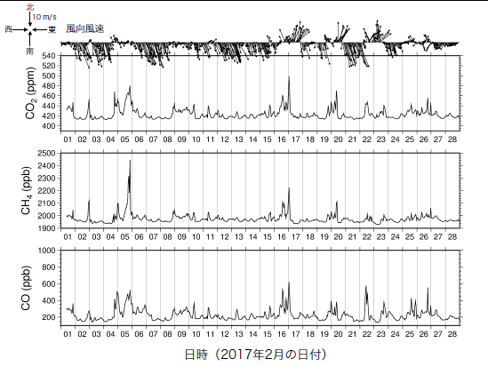 平成29年2月に得られたCO2、メタン、CO濃度の同時観測データ(図5)から、数日〜10日程度ごとに、CO2、メタン、CO濃度が急増するイベントが観測されました(2月4〜5日、16〜17日、19〜20日、22〜23日)。この濃度増加イベントは、北西風から南よりの風に変わったときに起こっていたことから、東京湾岸の大規模事業所から排出された空気を観測したものと推察されます。また、各イベントで増加する成分の比が異なることなども観測されました。こうした濃度増加イベントと気象場との関係、CO2、メタン、COの成分比、さらに酸素濃度と炭素同位体を分析することで、CO2排出源の解析を進めていきます。