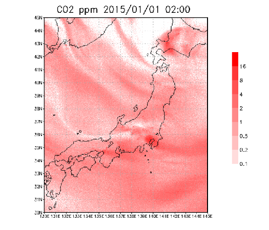 パリ協定で合意された「世界平均気温の上昇を、工業化前を基準に2℃より十分低く保つとともに、1.5℃に抑える努力を追求する」目標を達成するためには、さらなる温室効果ガス排出量の削減が不可欠です。日本では、温室効果ガス排出量の92.5%が二酸化炭素(CO2)で、CO2排出量の95.1%が燃料の燃焼によるものです(国立環境研究所地球環境研究センター温室効果ガスインベントリオフィス編 「日本国温室効果ガスインベントリ報告書」2017年)。燃料の燃焼によるCO2排出量の中では発電が最も多く、自動車、業務と家庭といった都市活動に起因するCO2排出が次いで多くなっており、主要な温室効果ガス排出源として注目されています(図1は、都市と発電所から排出されたCO2のシミュレーション結果)。
