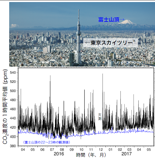 東京スカイツリーで観測された、平成28年4月から平成29年5月までのCO2濃度データを、富士山頂のCO2濃度(平成29年4月14日既報「富士山頂での自動CO2濃度観測機器による長期間観測の成功 —富士山頂で東アジア全体が把握できるCO2濃度が観測可能と判明—」)と比べたグラフを図4に示します。富士山頂のCO2データは、中緯度東アジア域における代表的な背景場の濃度を示していると考えられます。