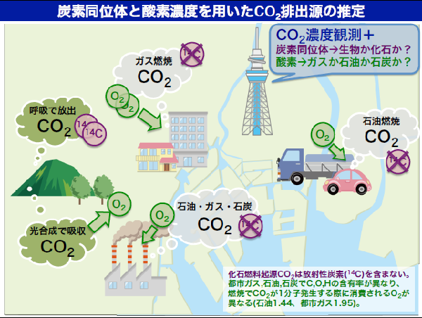 本観測では、CO2濃度だけでなく、CO2中の放射性炭素同位体比と大気中酸素濃度を高精度で分析することが特徴です。都市からは、さまざまなところからCO2が排出されていますが、CO2濃度と同時に放射性炭素同位体比を分析することで、そのCO2が植物の呼吸から出たものか、化石燃料を燃焼して出たものか、が推定できます。また、CO2濃度と同時に酸素濃度を分析することで、燃焼された燃料が天然ガスなのか、石油なのか、を推定することができます(図3)。