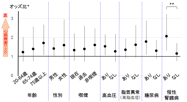 **慢性腎臓病の有無により統計学的に有意に黄砂と急性心筋梗塞との関連が異なる