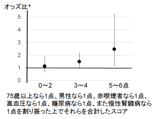 また、背景要因が複数ある場合に、さらに黄砂の影響を受けやすくなるかを検討するため、対象者に、75歳以上なら1点、男性なら1点、高血圧なら1点、糖尿病なら1点、非喫煙者なら1点、慢性腎臓病なら1点を割り振った上でそれらを合計し、0から6点までのスコアにしました。その結果、スコアが高い(5~6点)群でより黄砂の影響を受けやすいことが示されました(オッズ比2.45、95%信頼区間1.14-5.27)(図2)(背景要因によるスコア化は本研究の中で開発したものであり、別途検証が必要と思われます)。