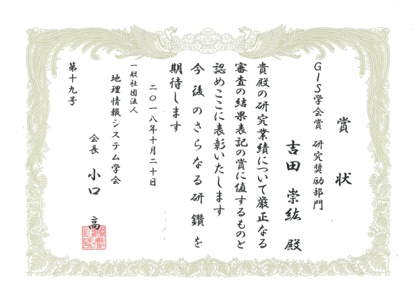 吉田 崇紘特別研究員がGIS学会賞(研究奨励部門)を受賞