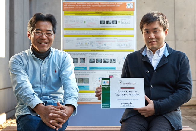 3rd International Conference on Alternative Fuels, Energy and Environmentにて”Aggregation of immobilized enzyme during transesterification of triolein and methanol, and the effect of two types of aggregates on reaction yield”という演題でポスター発表し、Best poster presentation awardを頂きました。固定化酵素によるバイオディーゼル燃料(BDF)の合成は、既存の方法に比べて原料の過剰な投入を回避でき、副生成物の再生利用にも適しています。そこで、ビーカーレベルでBDFの合成実験を行ったところ、反応途中で固定化酵素が凝集し、反応が進まないことを確認しました。凝集過程では二種類の凝集体が生成されることから、各凝集体の生成条件を見出し、反応性の違いを明らかにしました。特に、反応容器、固定化酵素、副生成物等の相互作用を利用して、凝集体の形態を制御した手法が独創的であり、その点が評価されたものと思っています。我々の研究グループではバイオガス(メタンガス)等を含めて様々なバイオ燃料の製造技術を開発しており、今回のようなオリジナルな発想で開発してきた技術をより高効率化・低コスト化させ、社会実装を目標に頑張っていきたいと思います。
