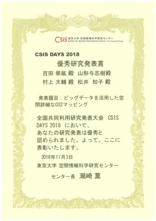 受賞対象: ビッグデータを活用した空間詳細なCO2マッピング,東京大学空間情報科学研究センター全国共同利用研究発表大会:CSIS DAYS 2018, 研究アブストラクト集 ,2018