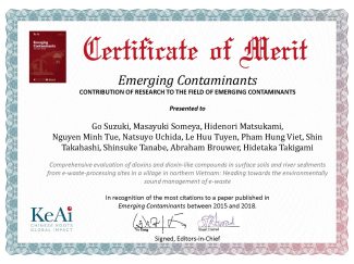 これら2つの論文は、国際誌「Emerging Contaminants」に掲載された論文の中で、2015~2018年にかけて世界で引用されている回数が多い論文として、上位10報に与えられる「Best Paper Award」を受賞しました。第3期中期計画の資源循環研究プログラムにおいて、愛媛大学及びベトナム国家大学ハノイ校等と共同で実施して得られた成果になります。